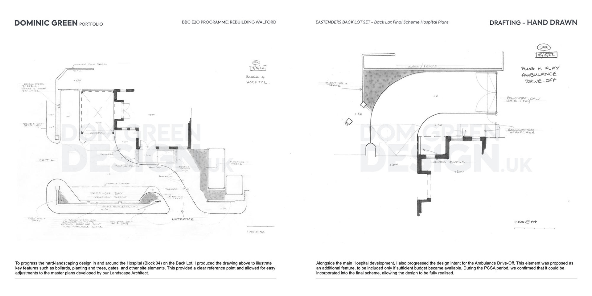 To progress the hard‑landscaping design in and around the Hospital (Block 04) on the Back Lot, I produced the drawing above to illustrate key features such as bollards, planting and trees, gates, and other site elements. This provided a clear reference point and allowed for easy adjustments to the master plans developed by our Landscape Architect.
