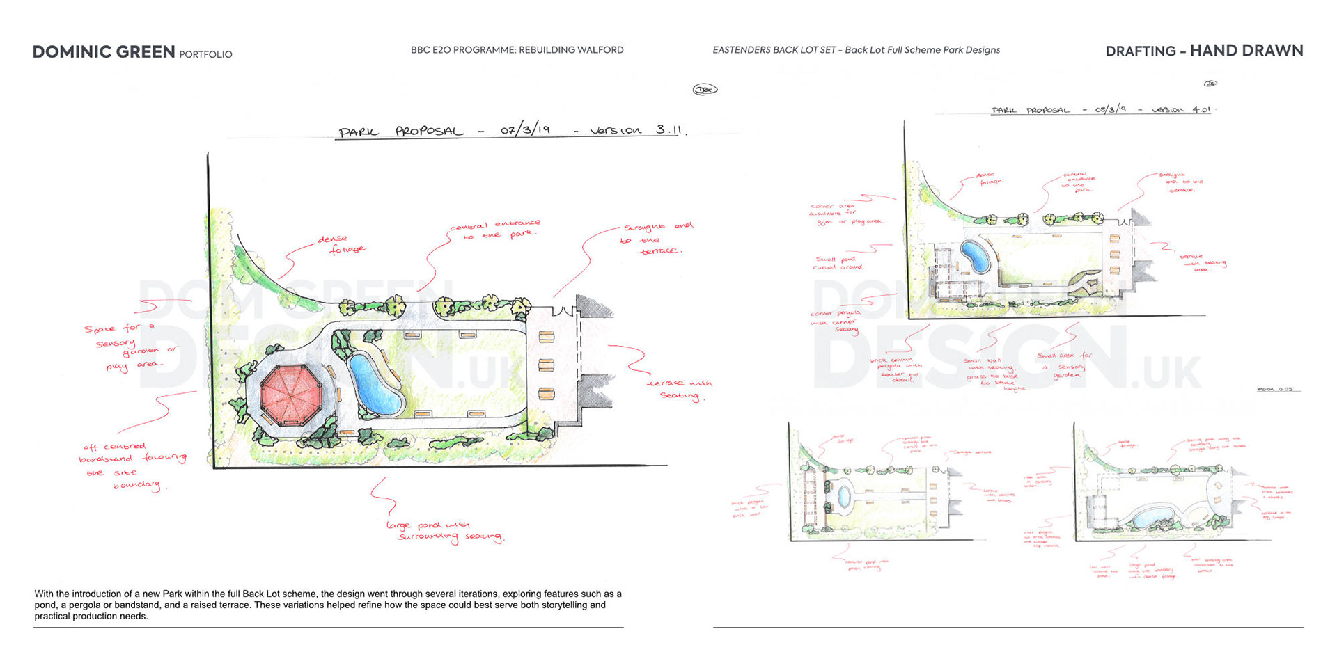 With the introduction of a new Park within the full Back Lot scheme, the design went through several iterations, exploring features such as a pond, a pergola or bandstand, and a raised terrace. These variations helped refine how the space could best serve both storytelling and practical production needs.