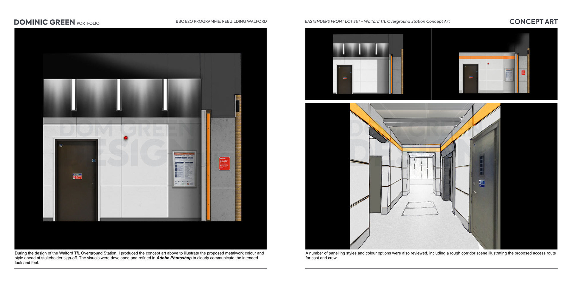 During the design of the Walford TfL Overground Station, I produced the concept art above to illustrate the proposed metalwork colour and style ahead of stakeholder sign‑off. The visuals were developed and refined in Adobe Photoshop to clearly communicate the intended look and feel.