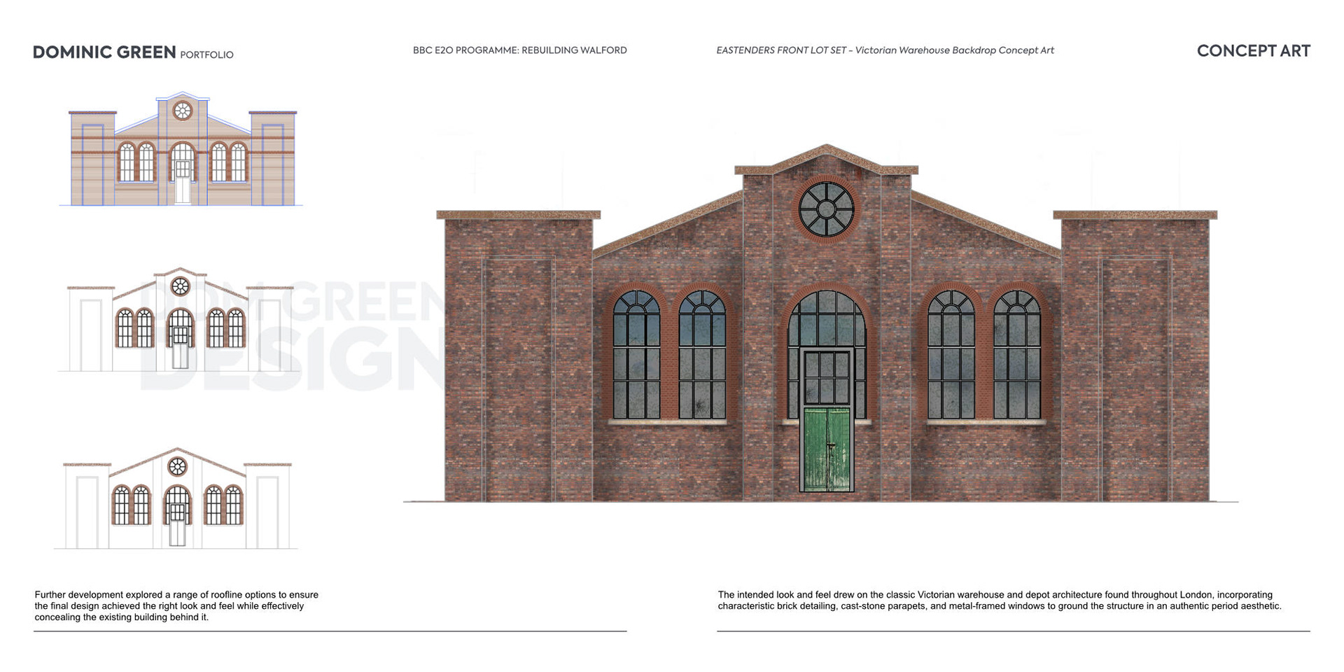 The intended look and feel drew on the classic Victorian warehouse and depot architecture found throughout London, incorporating characteristic brick detailing, cast‑stone parapets, and metal‑framed windows to ground the structure in an authentic period aesthetic.