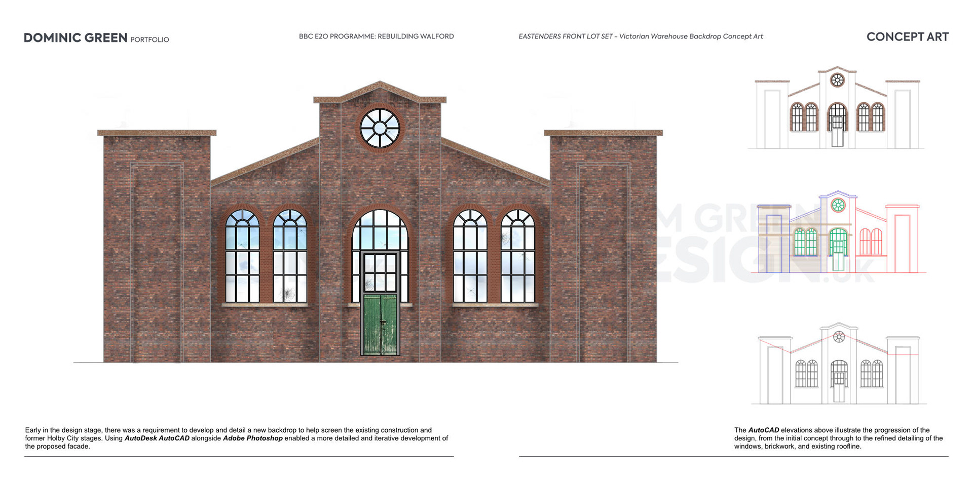 Early in the design stage, there was a requirement to develop and detail a new backdrop to help screen the existing construction and former Holby City stages. Using AutoDesk AutoCAD alongside Adobe Photoshop enabled a more detailed and iterative development of the proposed facade.