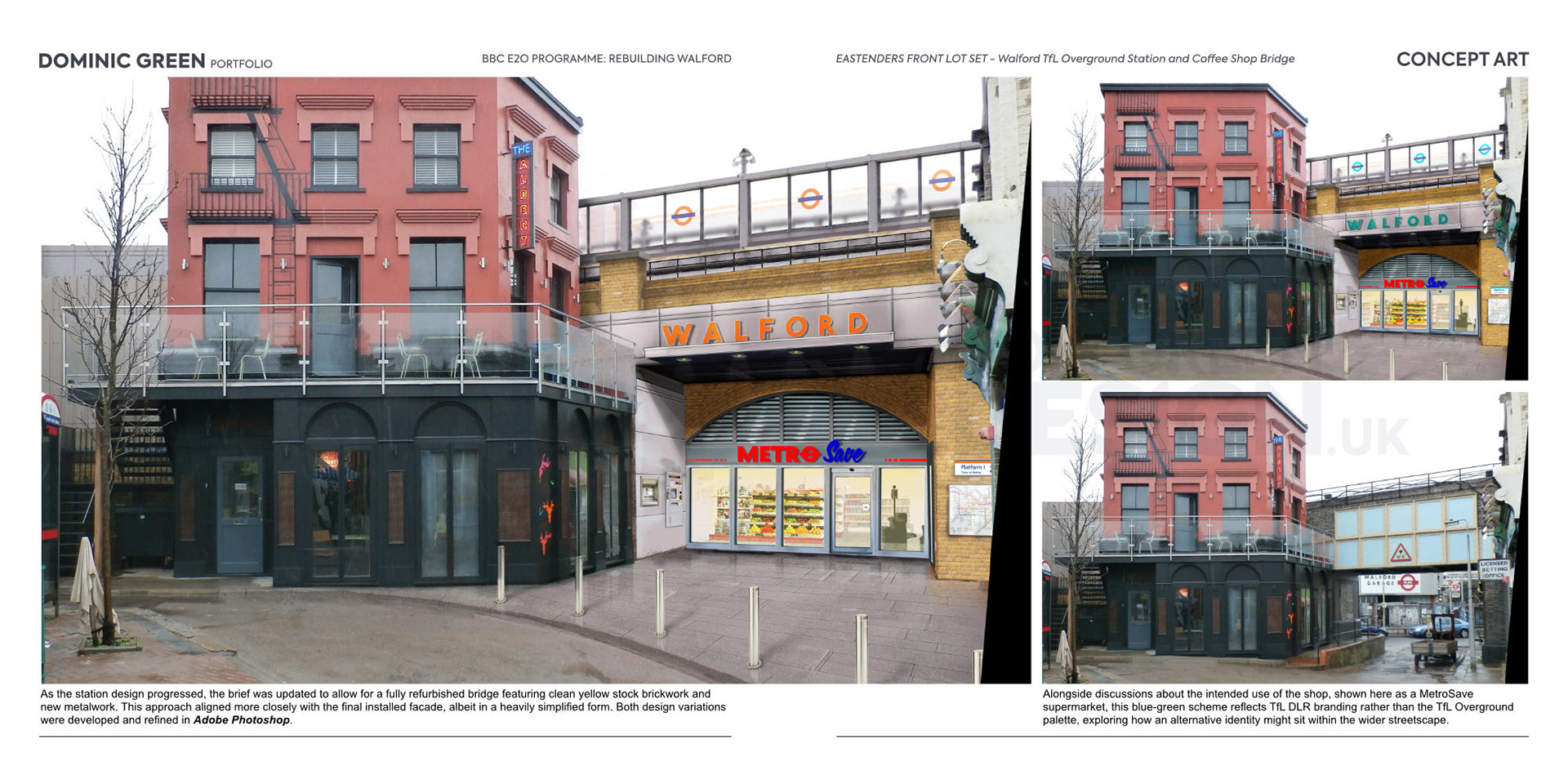 As the station design progressed, the brief was updated to allow for a fully refurbished bridge featuring clean yellow stock brickwork and new metalwork. This approach aligned more closely with the final installed facade, albeit in a heavily simplified form. Both design variations were developed and refined in Adobe Photoshop.
