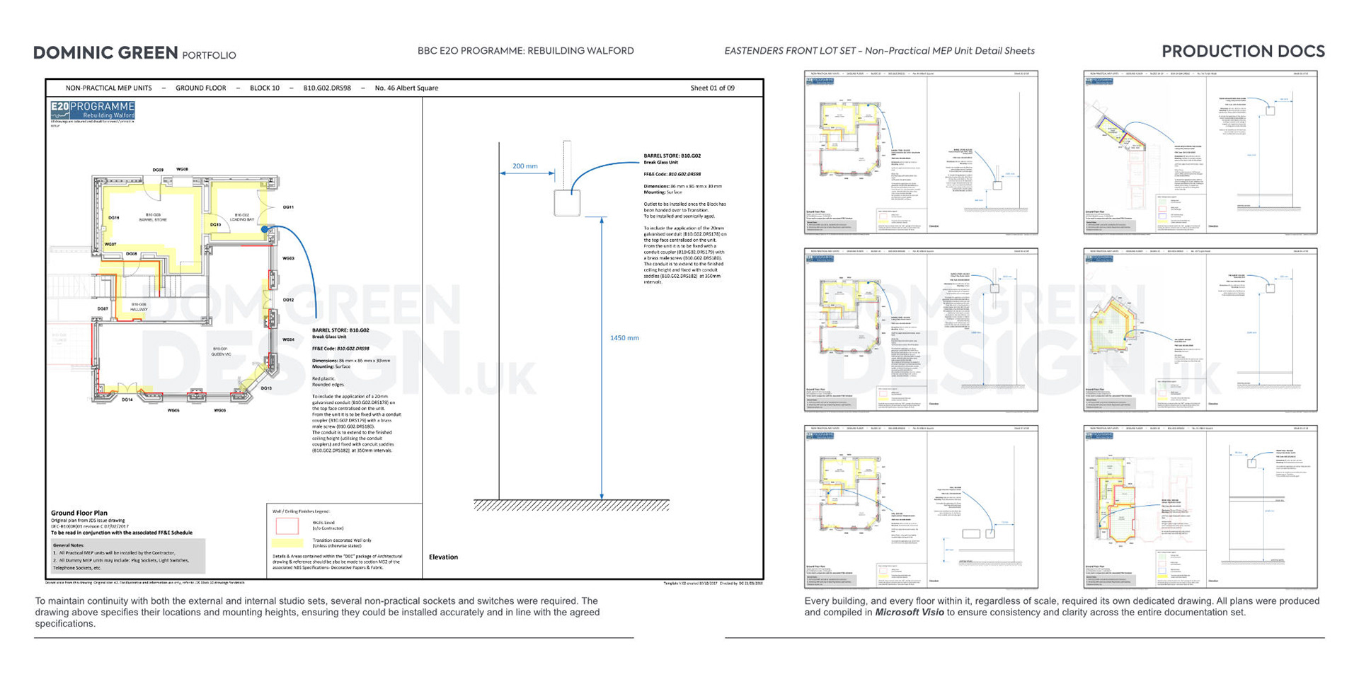 To maintain continuity with both the external and internal studio sets, several non‑practical sockets and switches were required. The drawing above specifies their locations and mounting heights, ensuring they could be installed accurately and in line with the agreed specifications.