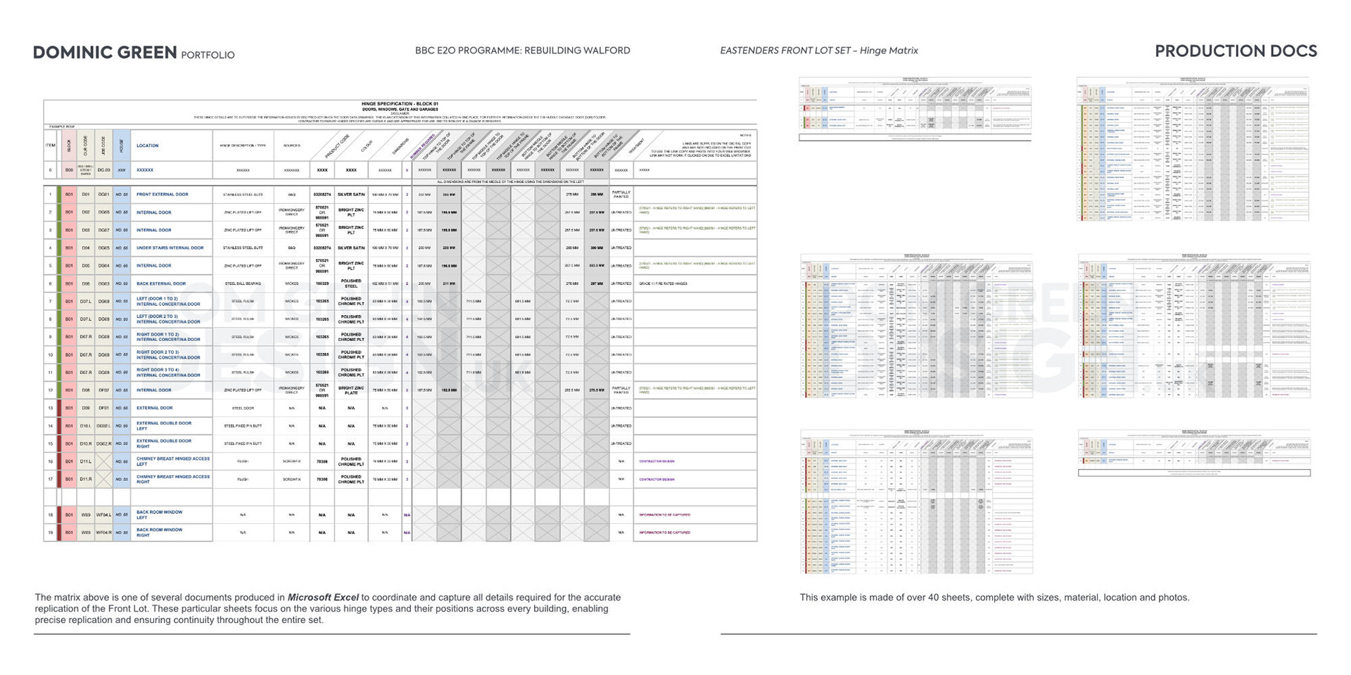 The matrix above is one of several documents produced in Microsoft Excel to coordinate and capture all details required for the accurate replication of the Front Lot. These particular sheets focus on the various hinge types and their positions across every building, enabling precise replication and ensuring continuity throughout the entire set.