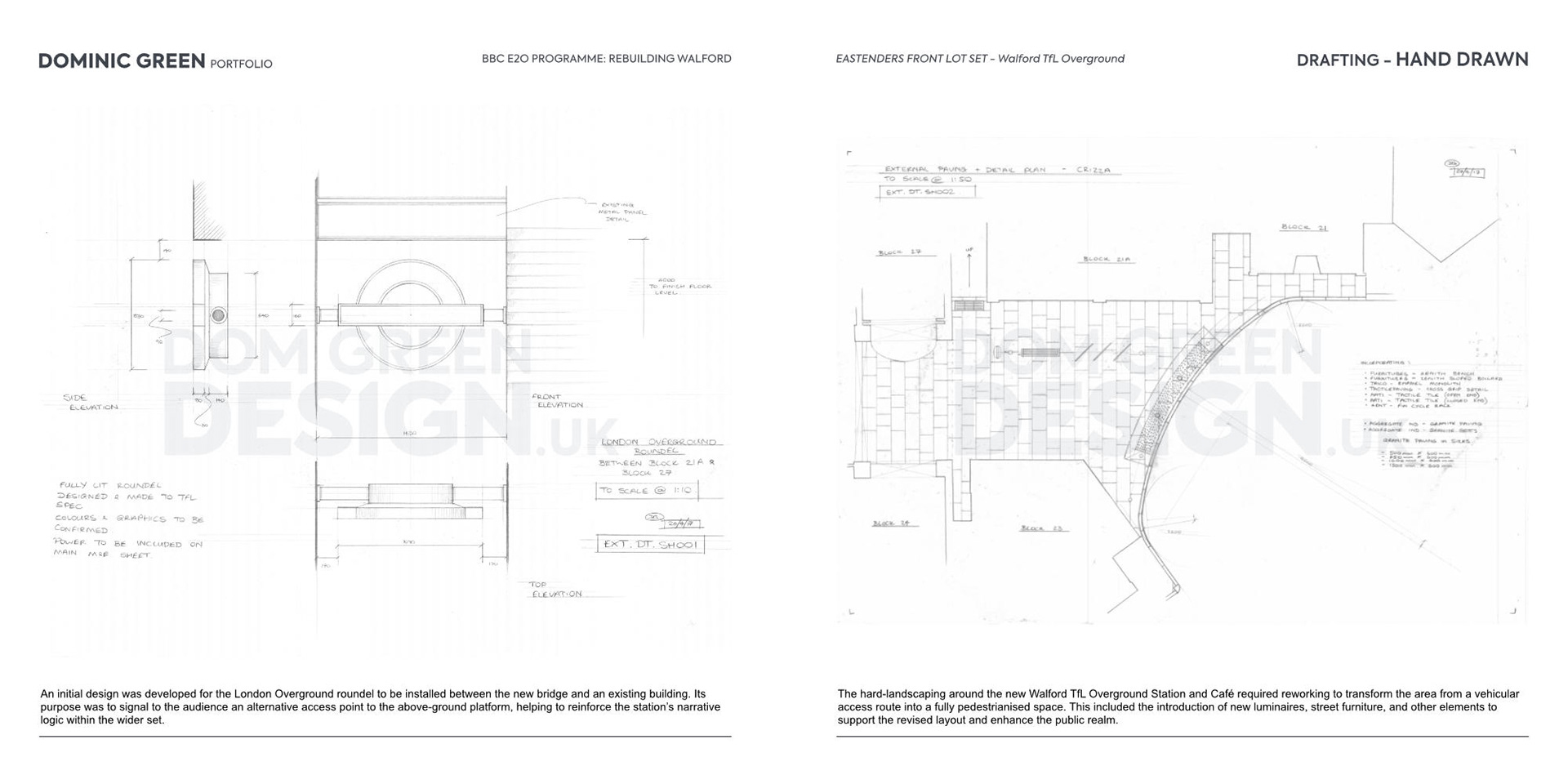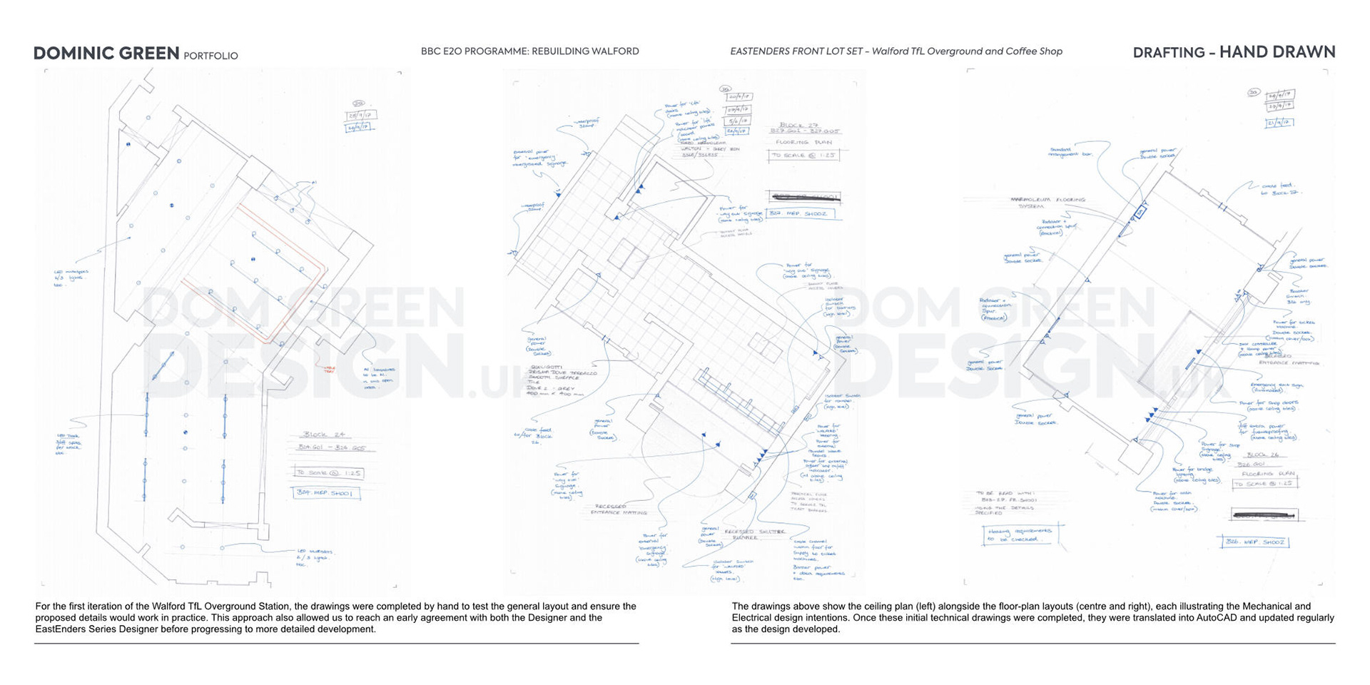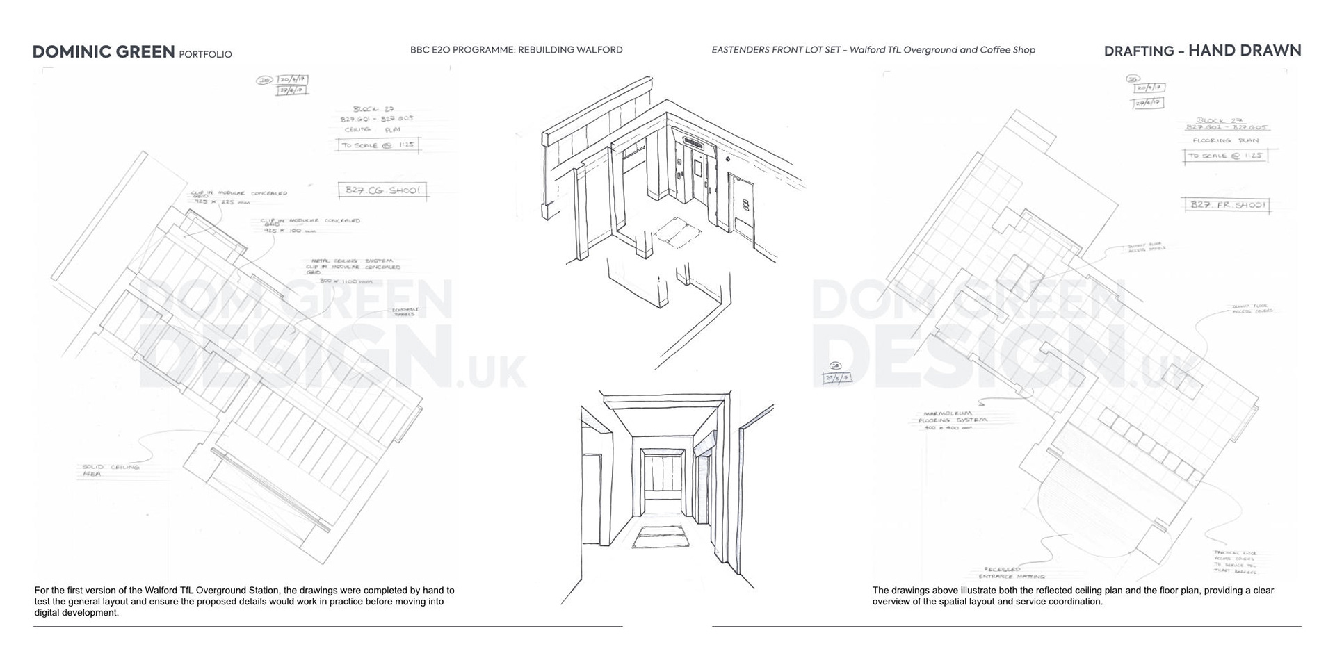 For the first version of the Walford TfL Overground Station, the drawings were completed by hand to test the general layout and ensure the proposed details would work in practice before moving into digital development.The main feature of Union Street on the Back Lot was the original Victorian corner shop, designed to echo a range of existing structures found across the East End of London while remaining deliberately understated and anonymous. This allowed it to blend seamlessly into the wider streetscape and support a variety of story needs.
