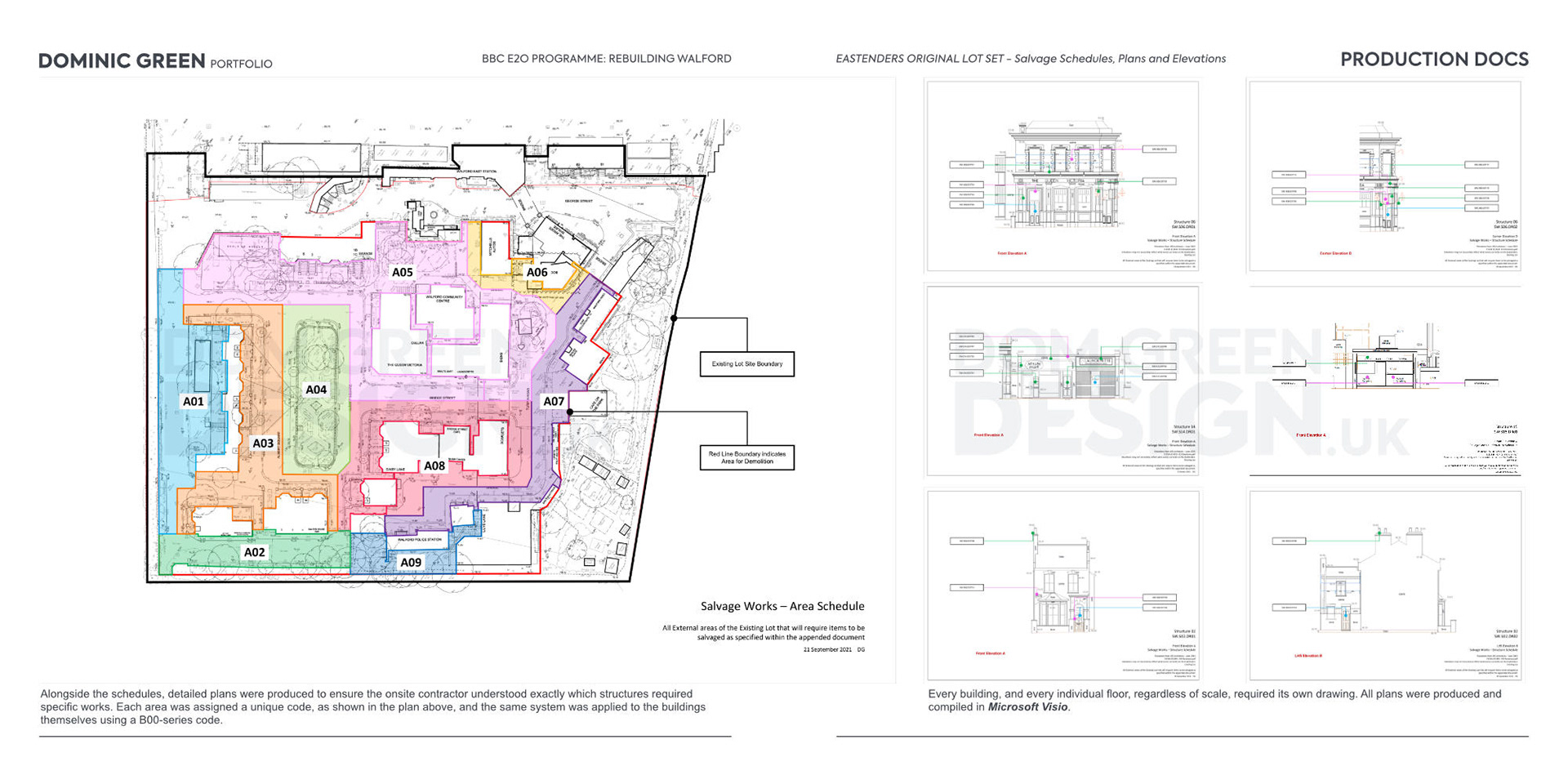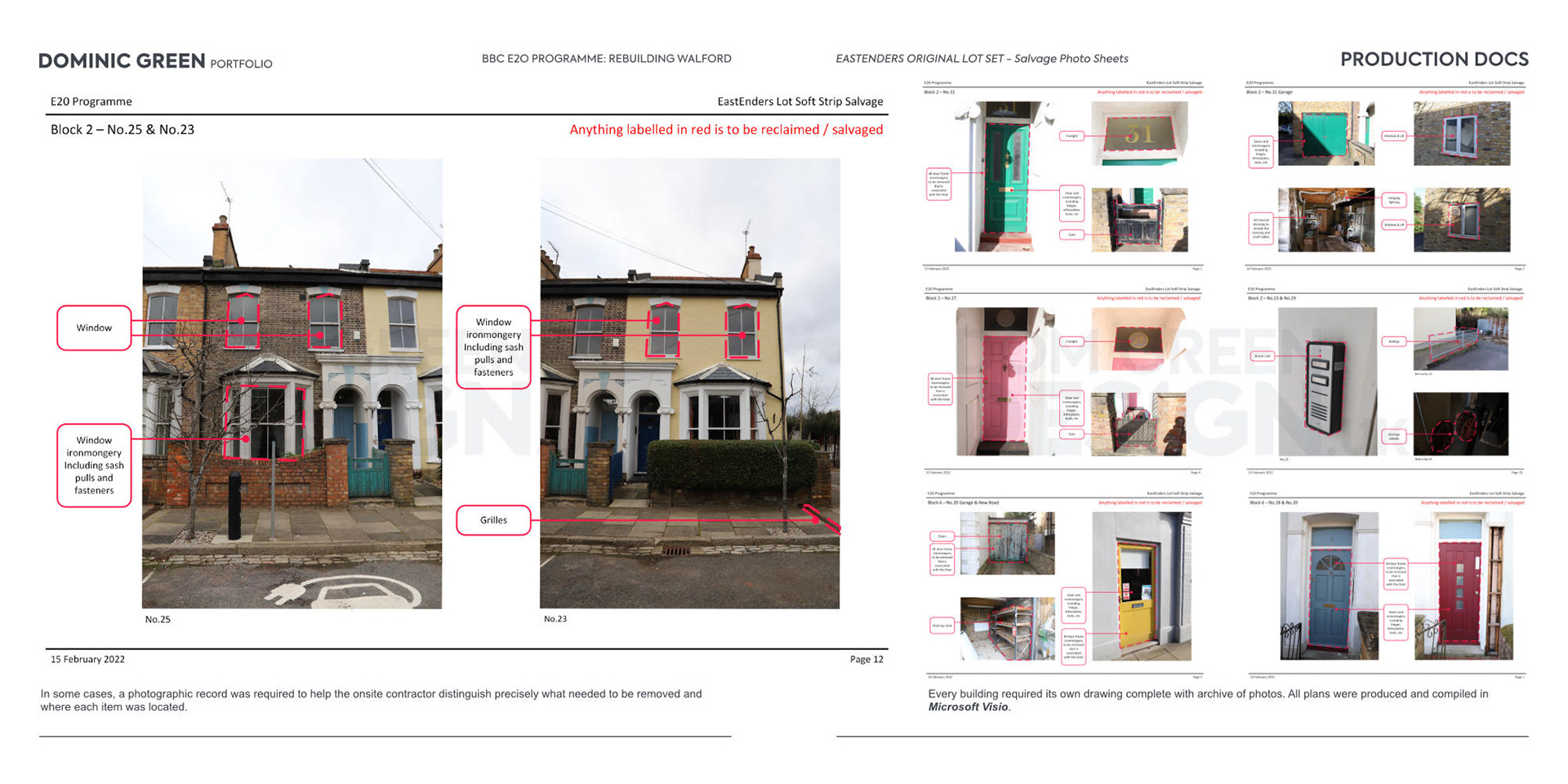 Prior to the demolition of the original EastEnders set, I coordinated the removal of any elements that could be salvaged and reused onsite. This involved recovering items from the structures, roadways, and surrounding areas, including doors, windows, bricks, ironmongery, and street furniture, to ensure valuable materials were preserved for future use.
