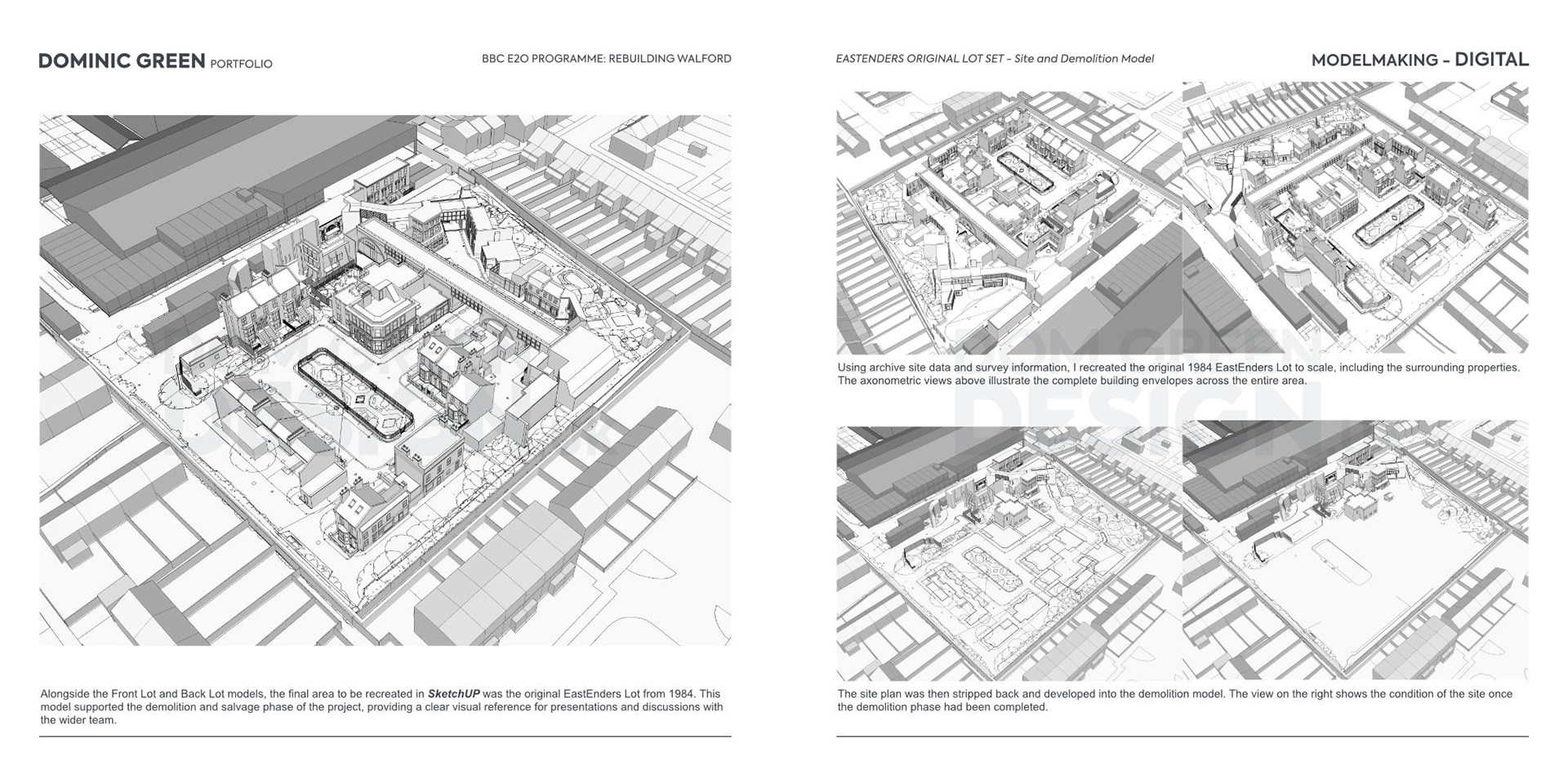 Alongside the Front Lot and Back Lot models, the final area to be recreated in SketchUP was the original EastEnders Lot from 1984. This model supported the demolition and salvage phase of the project, providing a clear visual reference for presentations and discussions with the wider team.