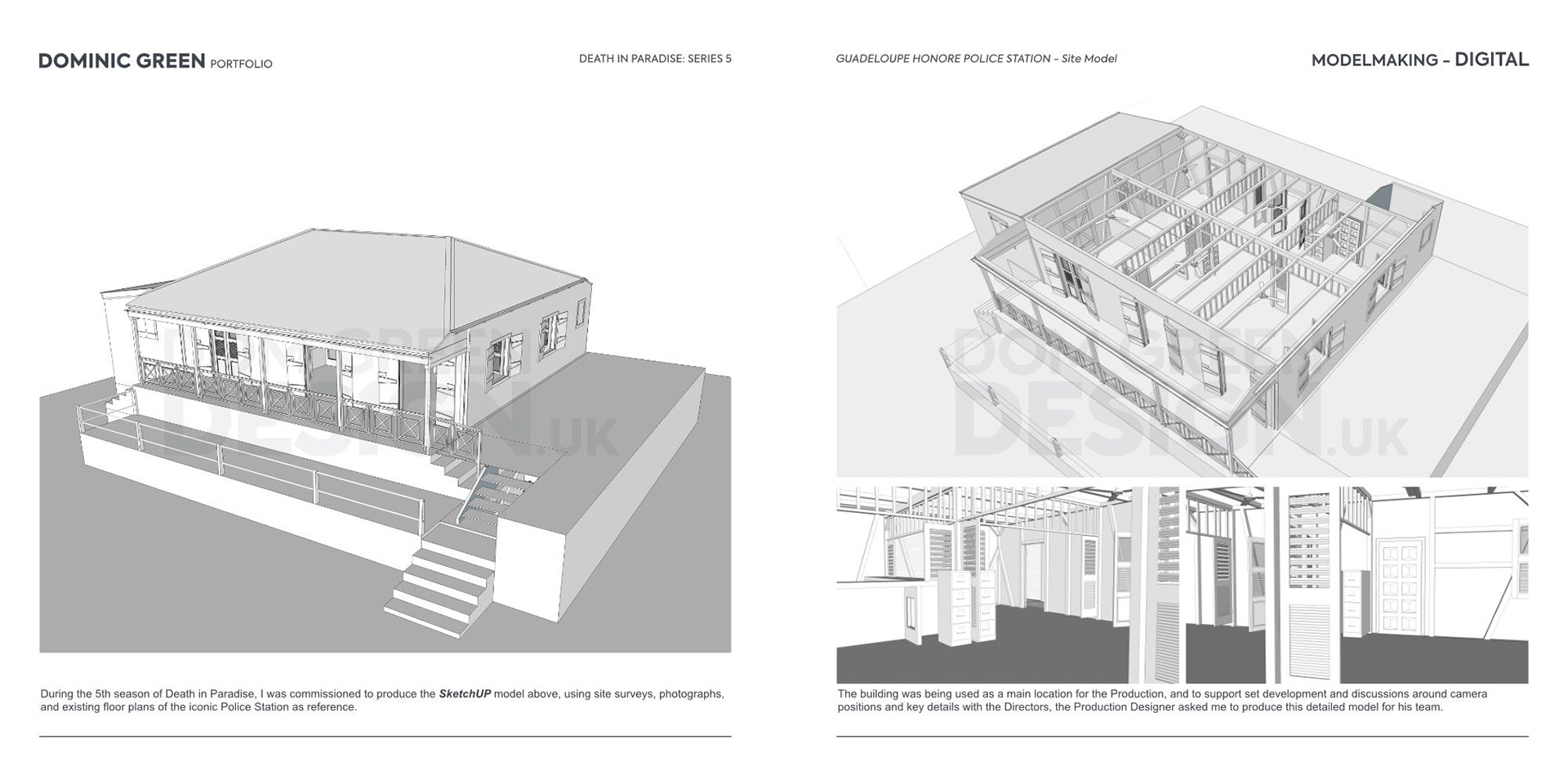 During the 5th season of Death in Paradise, I was commissioned to produce the SketchUP model above, using site surveys, photographs, and existing floor plans of the iconic Police Station as reference.