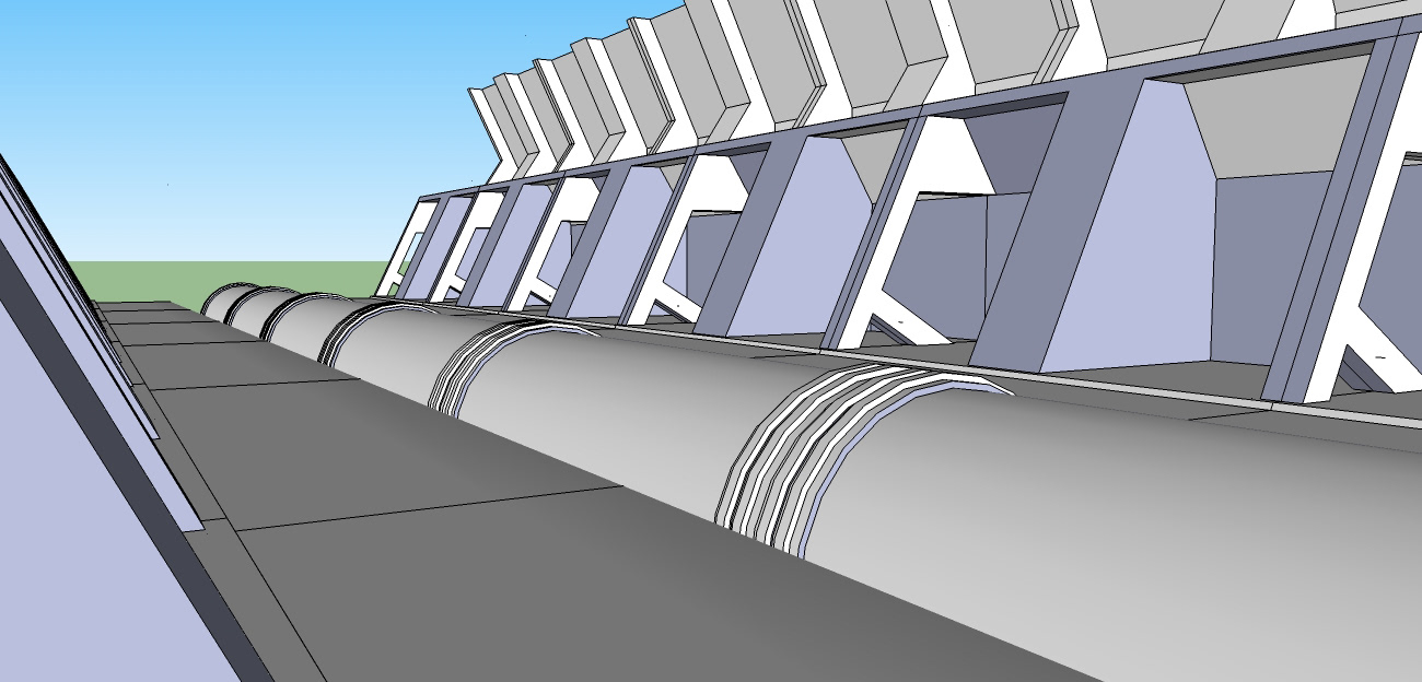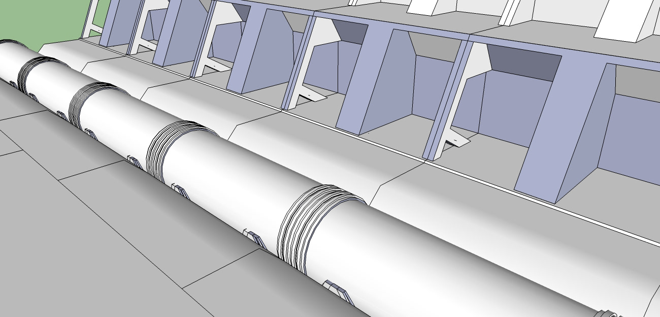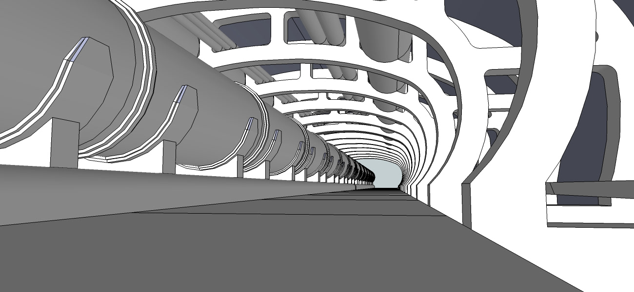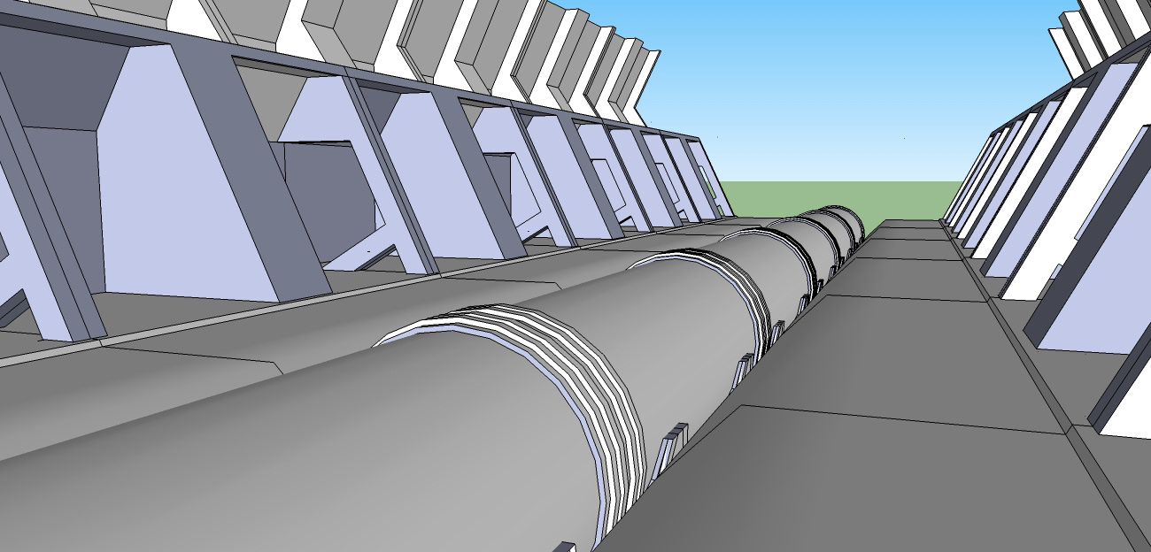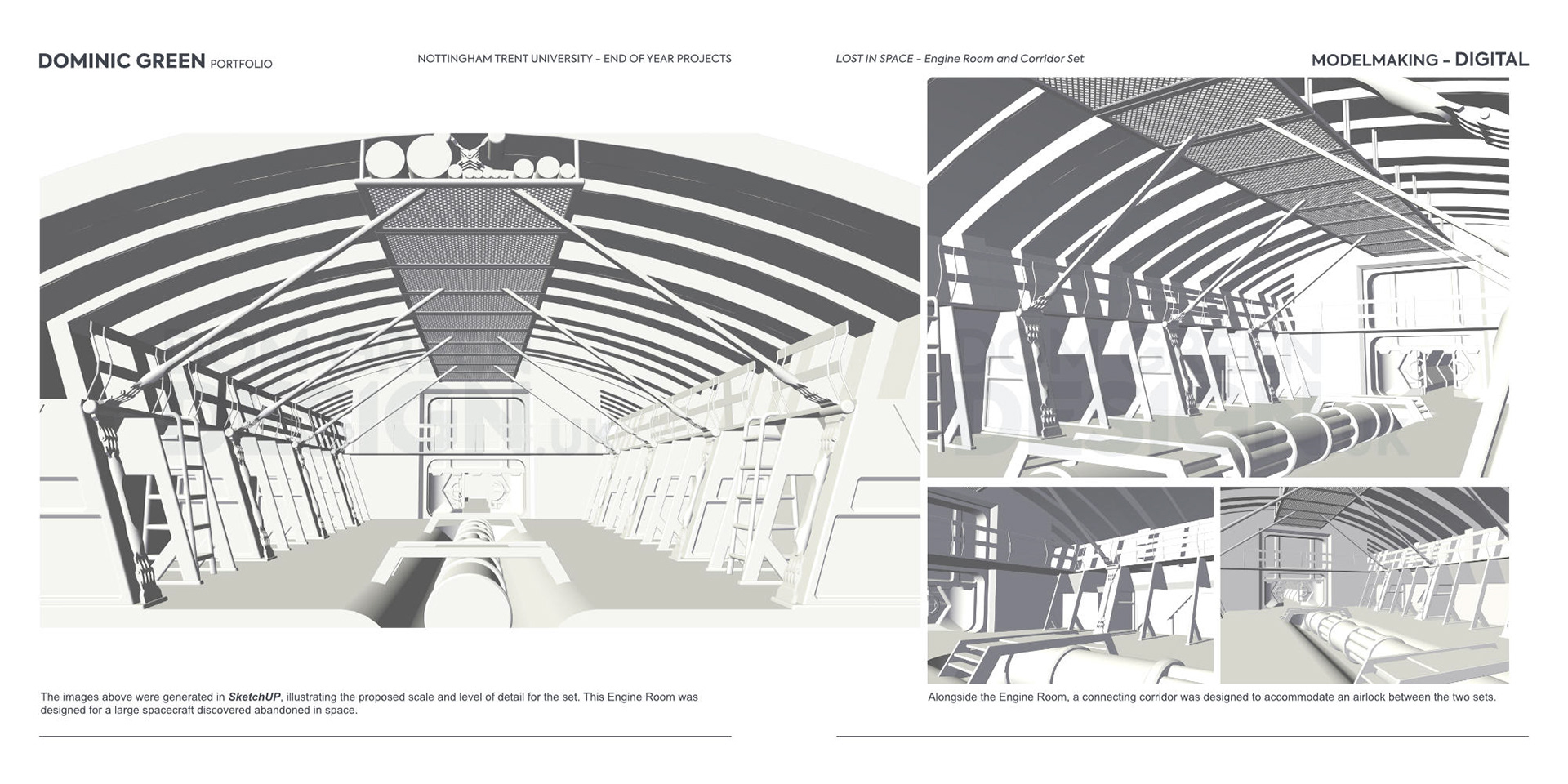 The images above were generated in SketchUP, illustrating the proposed scale and level of detail for the set. This Engine Room was designed for a large spacecraft discovered abandoned in space.