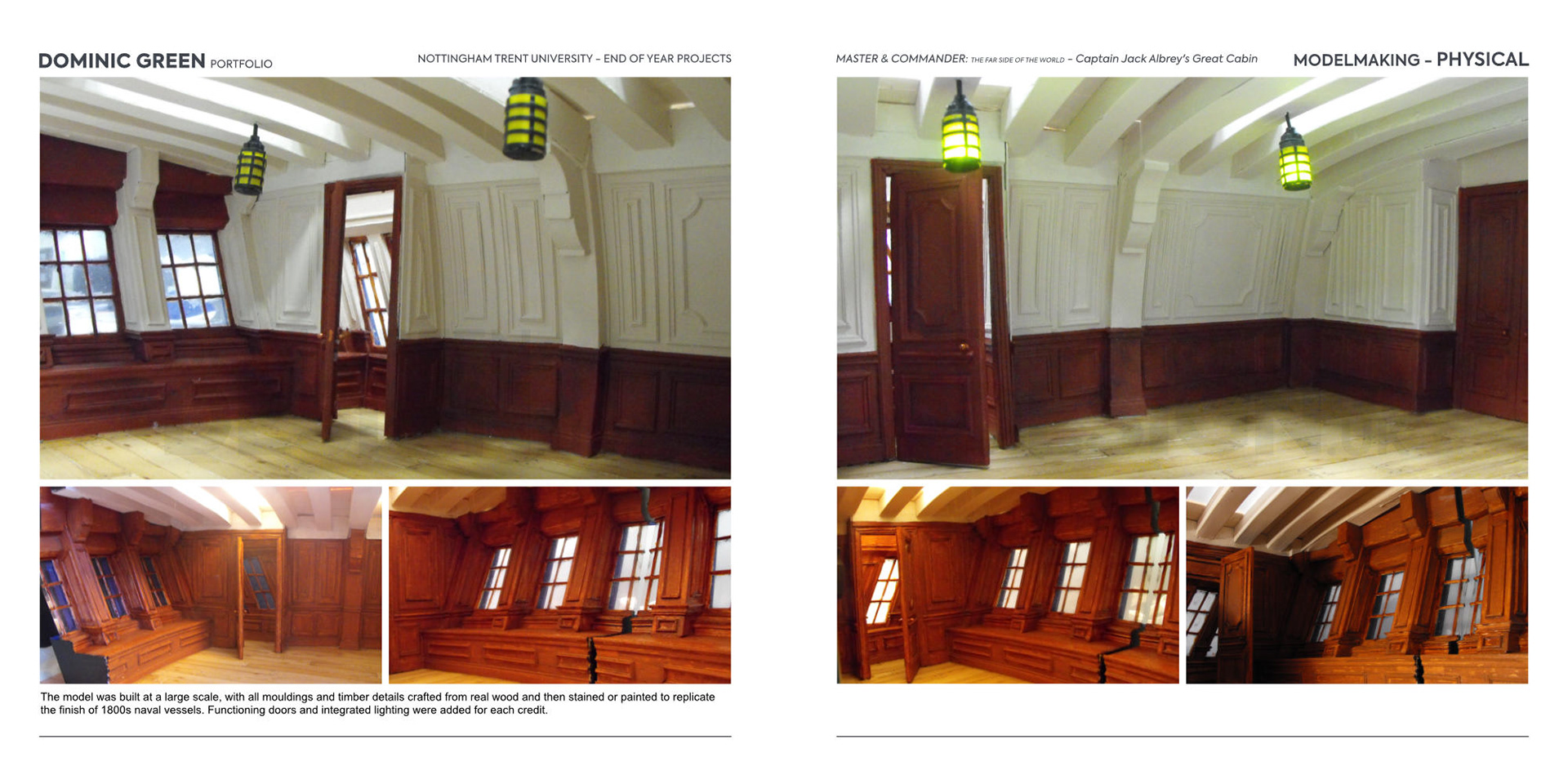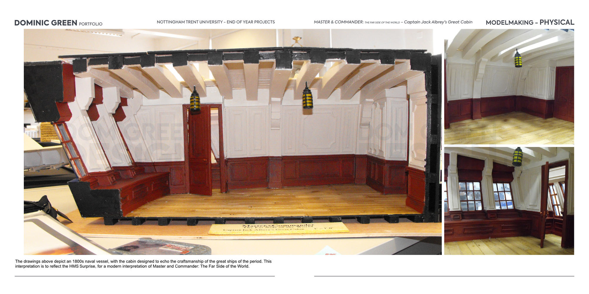 The model was built at a large scale, with all mouldings and timber details crafted from real wood and then stained or painted to replicate the finish of 1800s naval vessels. Functioning doors and integrated lighting were added for each credit.
